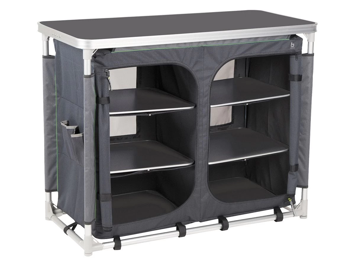 De kast is voorzien van een extra stevig 600D polyester hoes met daarin 6 handige legplanken. Het oplegblad van deze kast is hittebestendig, watervast en geschikt voor een 4-pits kooktoestel.