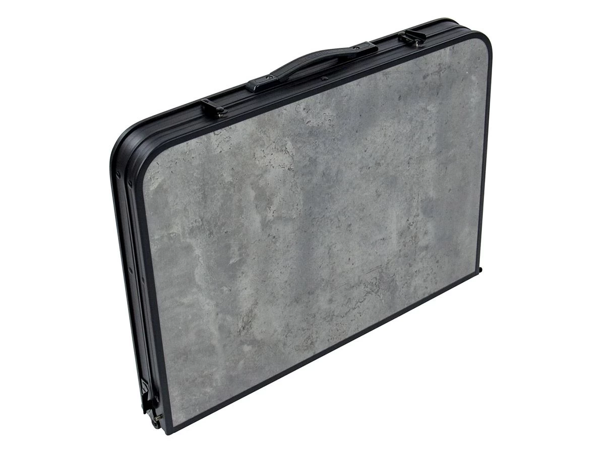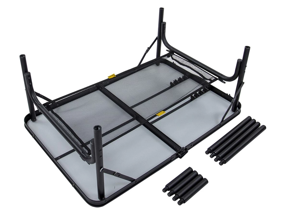 De afneembare tafelpoten zijn op te bergen onder het tafelblad, vervolgens is de tafel tot een compact pakket dubbel te klappen. Dankzij het handvat kun je de tafel makkelijk meenemen. Het zwarte frame is gemaakt van aluminium met daarop een MDF tafelblad. De tafel is dus niet bestand tegen water en hitte!