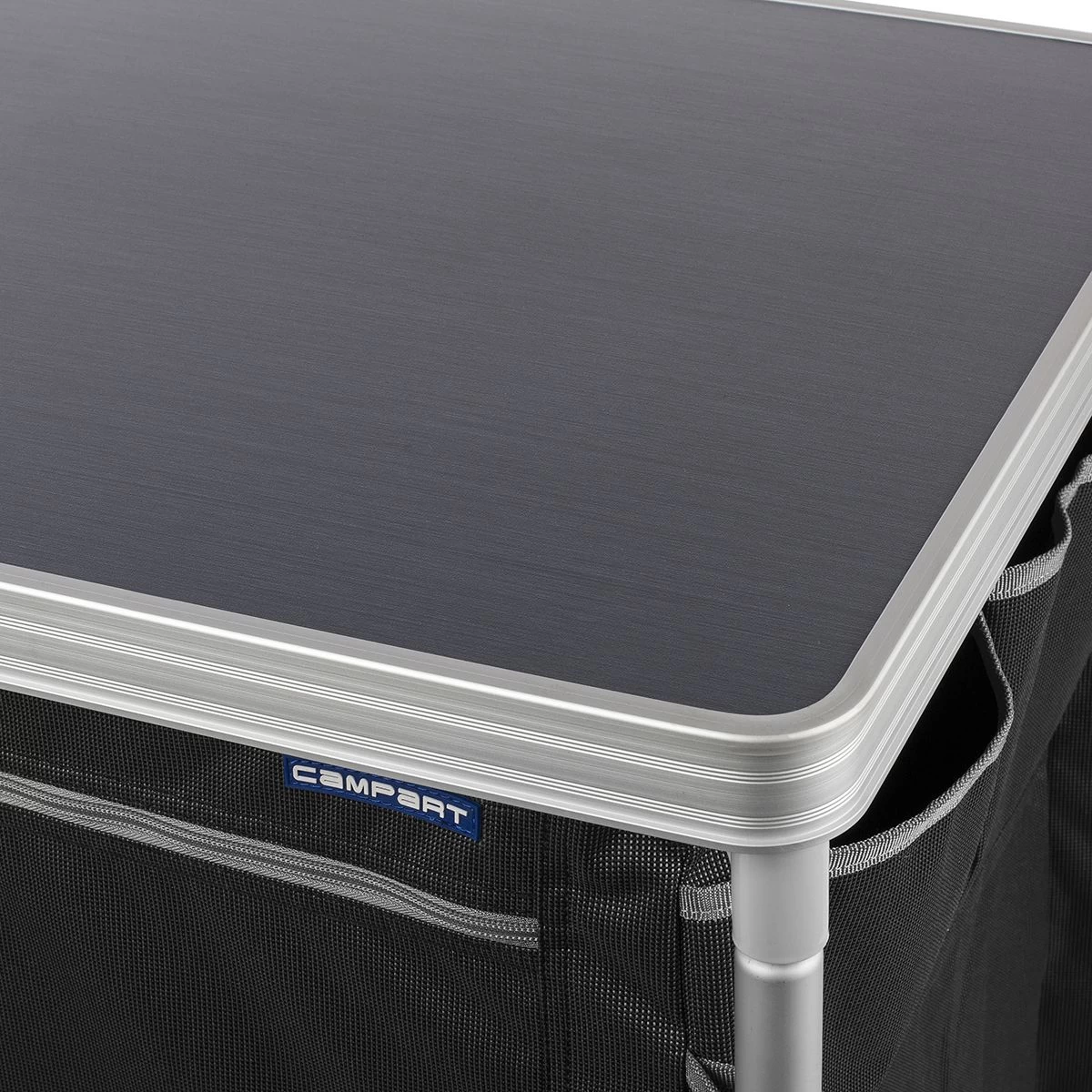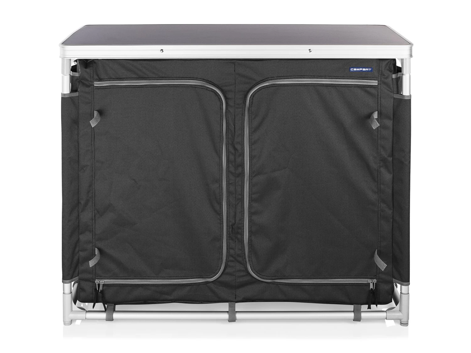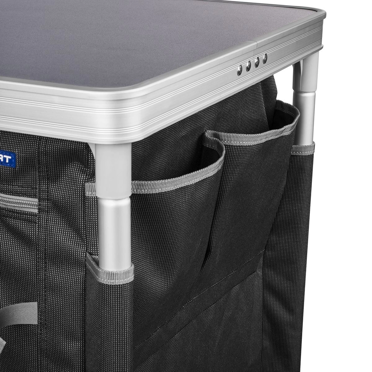 De kast heeft een lichtgewicht frame van aluminium en een bekleding van polyester. Zowel het bovenblad als de legplanken zijn gemaakt van MDF en afgewerkt met een aluminium rand, hierdoor is de kast NIET water- en hittebestendig. De kast is voorzien van vier verstelbare poten zodat je de kast altijd waterpas kunt zetten op een ongelijke ondergrond. Zodra de vakantie afgelopen is kun je de kast eenvoudig uit elkaar halen en opbergen in de meegeleverde draagtas.