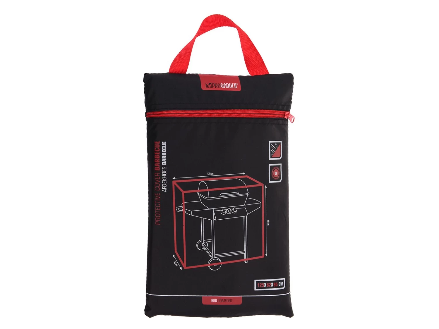 De hoes heeft een afmeting van 62 x 125 x 95 cm en is gemaakt van polyester. Onderaan de hoes zitten ogen zodat je de hoes gemakkelijk vast kunt maken.