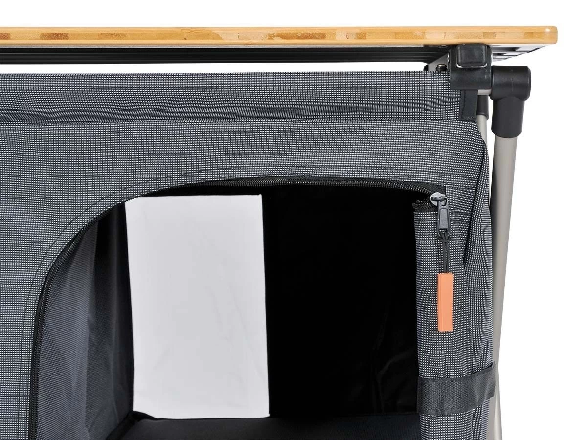 De Obelink Siena compact bamboo heeft vier ruime opbergvakken waarin je jouw kampeeruitrusting overzichtelijk kunt opbergen. De achterzijde is voorzien van mesh gaas dat ervoor zorgt dat de kast goed geventileerd wordt. Eén zijkant is voorzien van een opbergvakje. Het bamboe houten blad geeft de kast een mooi uiterlijk waarmee je meteen wat sfeer creëert in je tent. De kast is voorzien van twee verstelbare poten zodat je de kast waterpas kunt zetten op een ongelijke ondergrond.