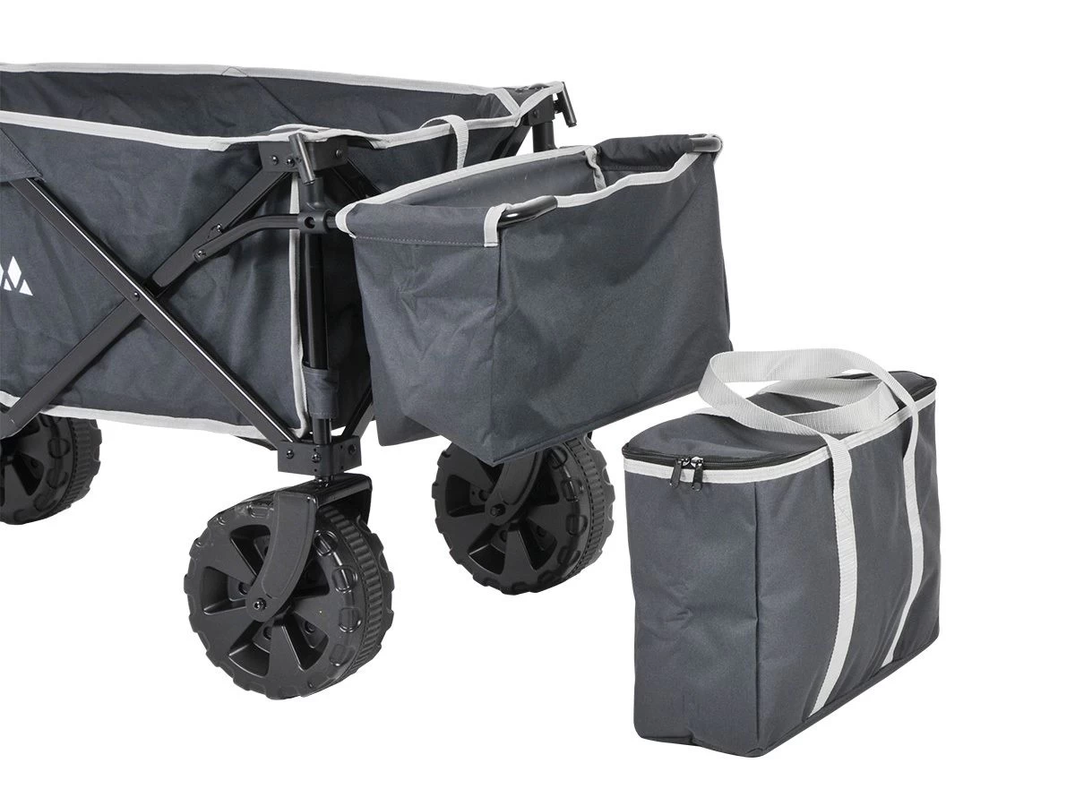 De binnenkant van de bolderkar heeft een afmeting van 90 x 45 x 30 cm en is gemaakt van stevig polyester. De onderkant is extra verstevigd voor een comfortabele zit. De achterkant is voorzien van een ruim opbergvak (45 x 18 x 26 cm) met daarin een losse koeltas. De koeltas is voorzien van een ritssluiting en 2 stevige handvatten.