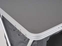De Obelink Duo Easy Luxe heeft drie ruime opbergvakken waarin je jouw kampeeruitrusting overzichtelijk kunt opbergen. De achterzijde is voorzien van mesh gaas dat ervoor zorgt dat de kast goed geventileerd wordt. Beide zijkanten zijn voorzien van drie ophanghaakjes, ideaal om bijvoorbeeld je handdoek of fleece vest aan op te hangen. Het blad is gemaakt van MDF en afgewerkt met een aluminium rand, hierdoor is de kast NIET water- en hittebestendig.