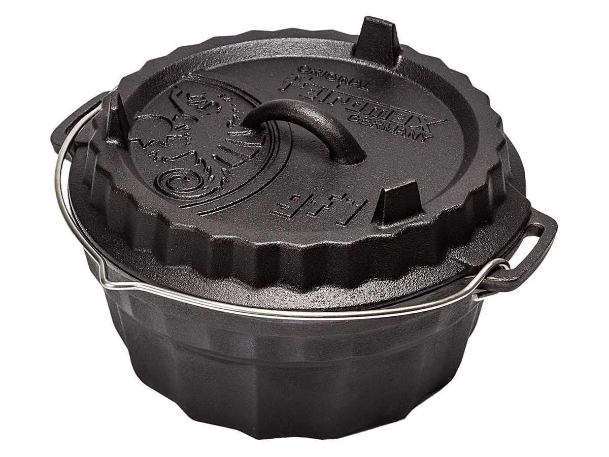 De multifunctionele deksel kan ook omgedraaid als taartvorm of als praktische koekenpan voor de buitenkeuken gebruikt worden!
