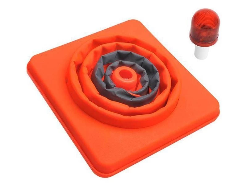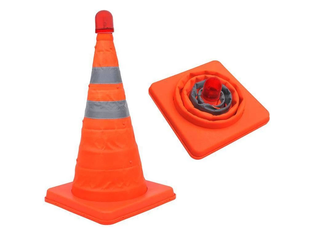Deze veiligheidspylon met knipperende LED verlichting is opvouwbaar en heeft twee reflecterende strepen. De pylon wordt geleverd in een handige draagtas voor gemakkelijke opslag en transport en werkt op 2x AAA batterijen.